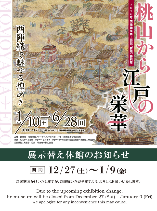 今から1,500年以上前。華やかな宮廷文化に端を発し、京の都には「日本の美意識の原点」が生まれました。 自然をいつくしみ、繊細さを愛おしむ、独特の価値観。仏教、武家、町民文化の影響を受けながら、その輝きはさらに洗練を極めていきます。 西陣織は、日本最古の伝統産業。平安の世から、うるわしい日本の美意識をたて糸に、職人たちの匠の技をよこ糸に織り継がれて、多くの人々を魅了しつづけています。西陣のなかでも最高の織技術(1800口織ジャガード)で表現された、花鳥風月や先人の芸術作品の数々をどうぞご堪能ください。